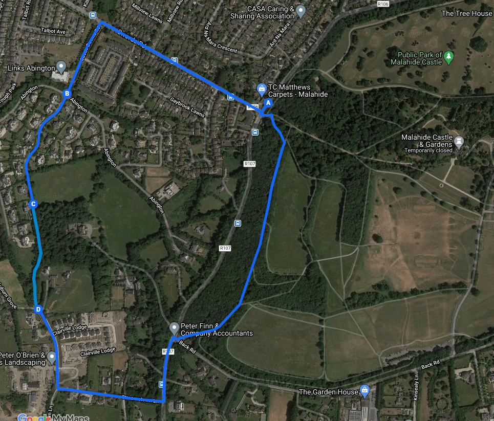 Begin at Malahide Castle (Swords Rd. gate). Walk along Swords Road to Castle Heath and turn left. Entering Abington keep straight and follow road to end and through gate. Between C and D on the map there is a woodland path (can be muddy). Cross the road at Auburn (carefully!) and enter Malahide Castle.