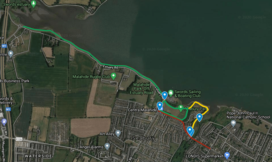 There’s a lovely short (approx 800 metres) “Share With Care” walking cycling path around Estuary Park Seabury – perfect for young children. Nice playground and exercise machines too. Lovely views of the estuary. The residents of Malahide and especially those of Seabury have been campaigning for almost 20 years for a safe walking cycling route from Seabury to St. John Paul II’s primary school and onwards to the Dart station, Malahide Demesne and all other local amenities. The Active Travel subcommittee of the Malahide Community Forum is supporting residents and liaising with Fingal County Council regarding the provision of “Safe Routes to School & to local amenities”.